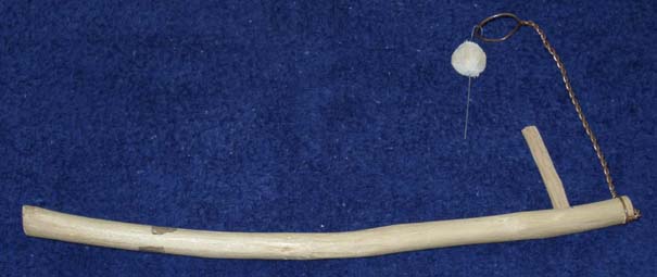 There are several references to this toy from both primary and secondary sources. A secondary source attributes it to a French toy named le pendu. In a macabre twist, the inspiration was said to be a body hanging from the gallows. In a bit lighter tone, in books from the 1850's and 1860's there is mention of suspending a pea on a stream of air. So the toy could have very easily have existed during the civil war period. To watch the toy in action is a lot easier than to descibe how to play with it. The play begins with the wire that extends below the pith ball is inserted in the vertical tube. The user then blows in the open end of the horizontal pipe and lifts the ball into the air with the goal of hooking a hook on top of the ball onto a wire loop (the copper wire contraption at the far right end of the toy in the picture. The secret of success is in blowing gently but evenly to slowly lift the pith ball up until the straight wire comes out of the vertical tube and the ball begins to spin. The hook can then be caught on the wire loop. If you have many children who want to play with the toy but you don't want everyone to be